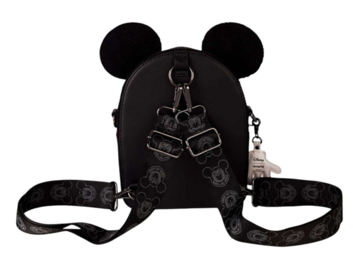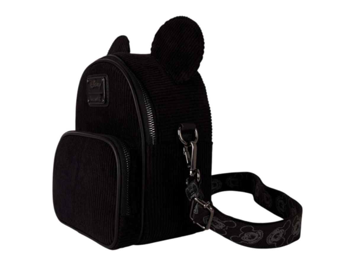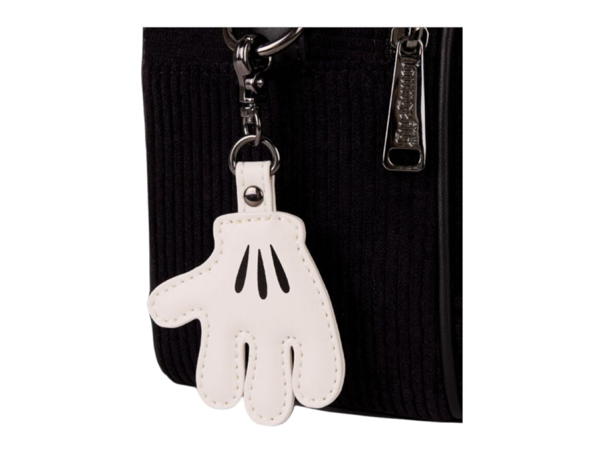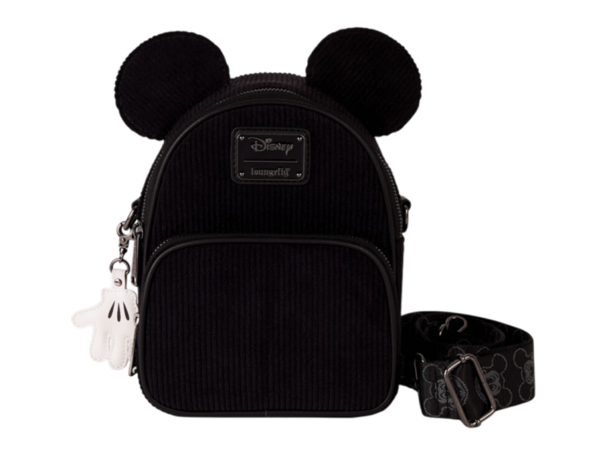 This stylish black bag features Mickey Mouse's applique ears, which rise up over the top, and they're covered in a black corduroy material. A vegan leather zipper charm of Mickey Mouse's gloved hand tops off the look—and it's removable, so you can swap it out with other zipper charms to change things up!