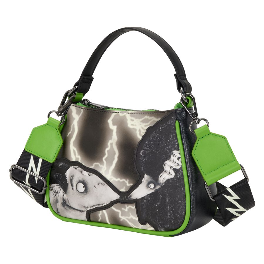 This crossbody bag features Sparky and Persephone from Frankenweenie. They're surrounded by glow-in-the-dark lightning strikes. Turn the bag around to find a swirling design that also glows in the dark. The adjustable crossbody strap has a lightning design on it.