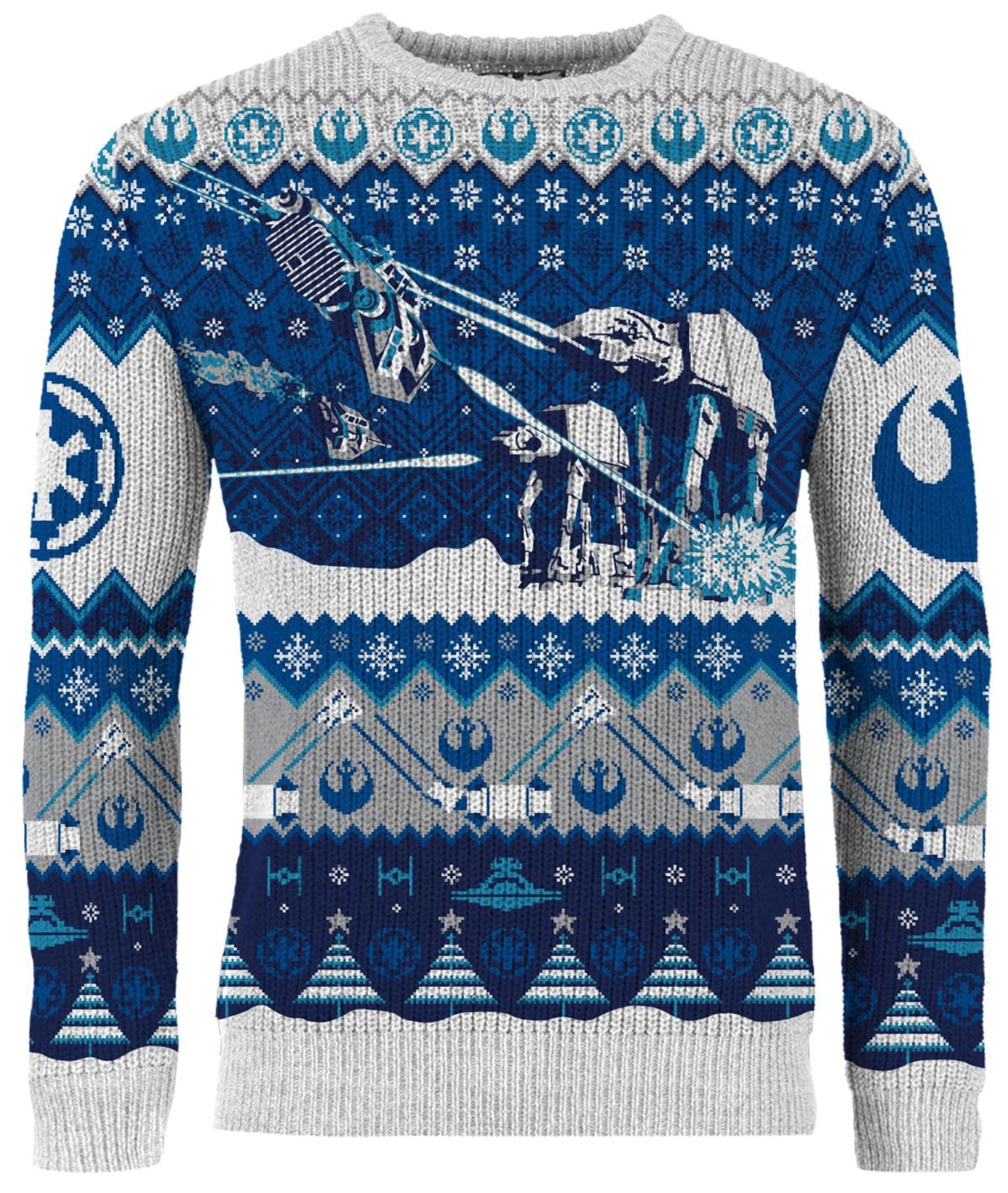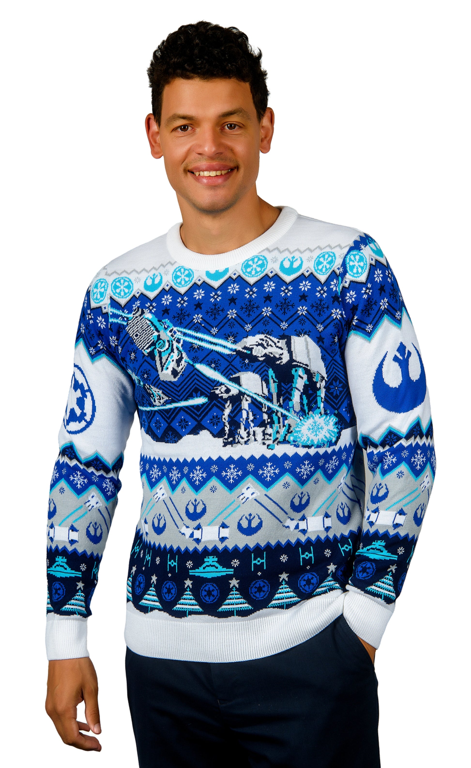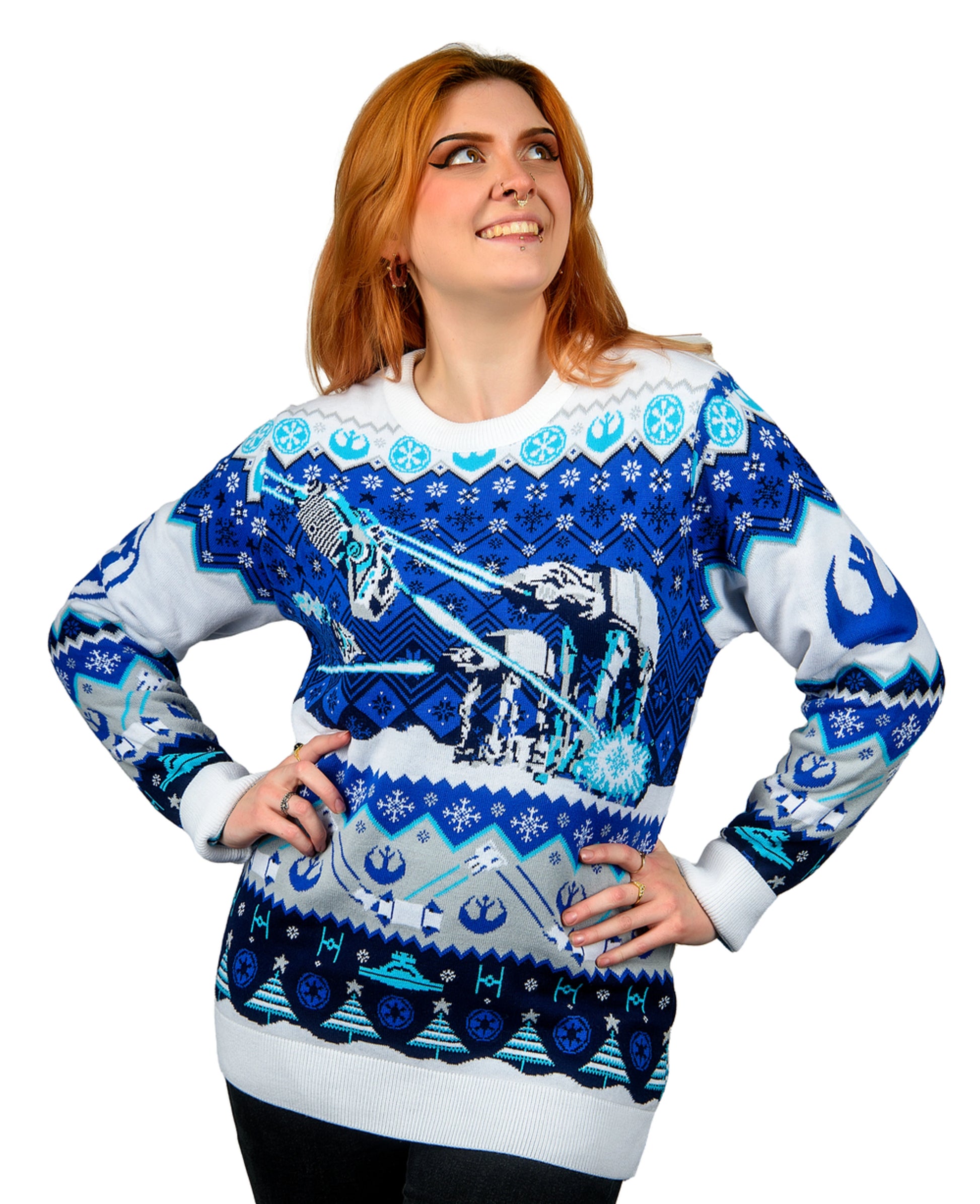 March into the holiday season with the Star Wars: AT-AT Assault Christmas Jumper. This officially licensed sweater showcases the Battle of Hoth, with AT-ATs deploying against a wintry backdrop, perfect for fans ready to face the festive chill.