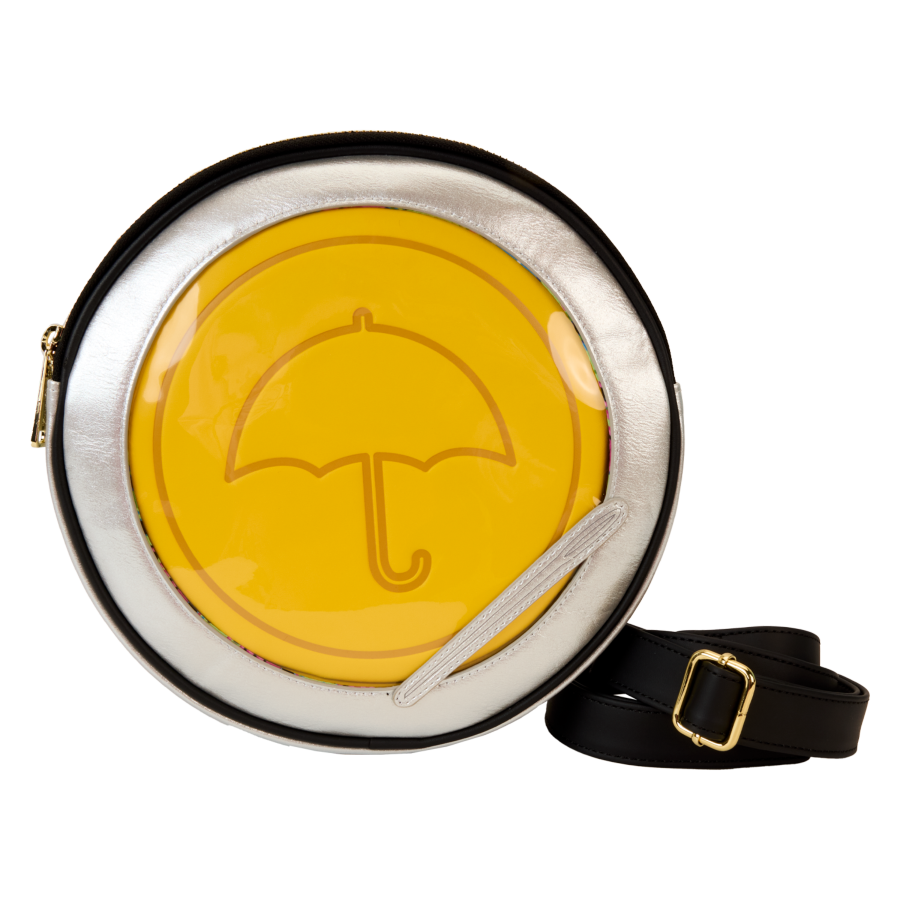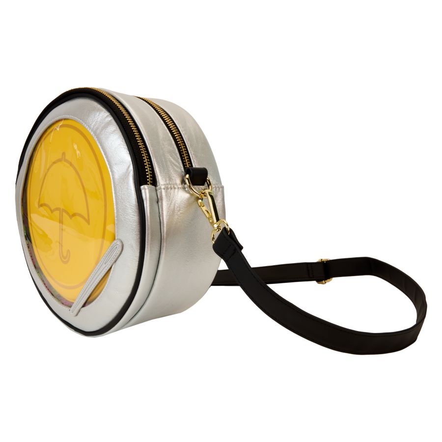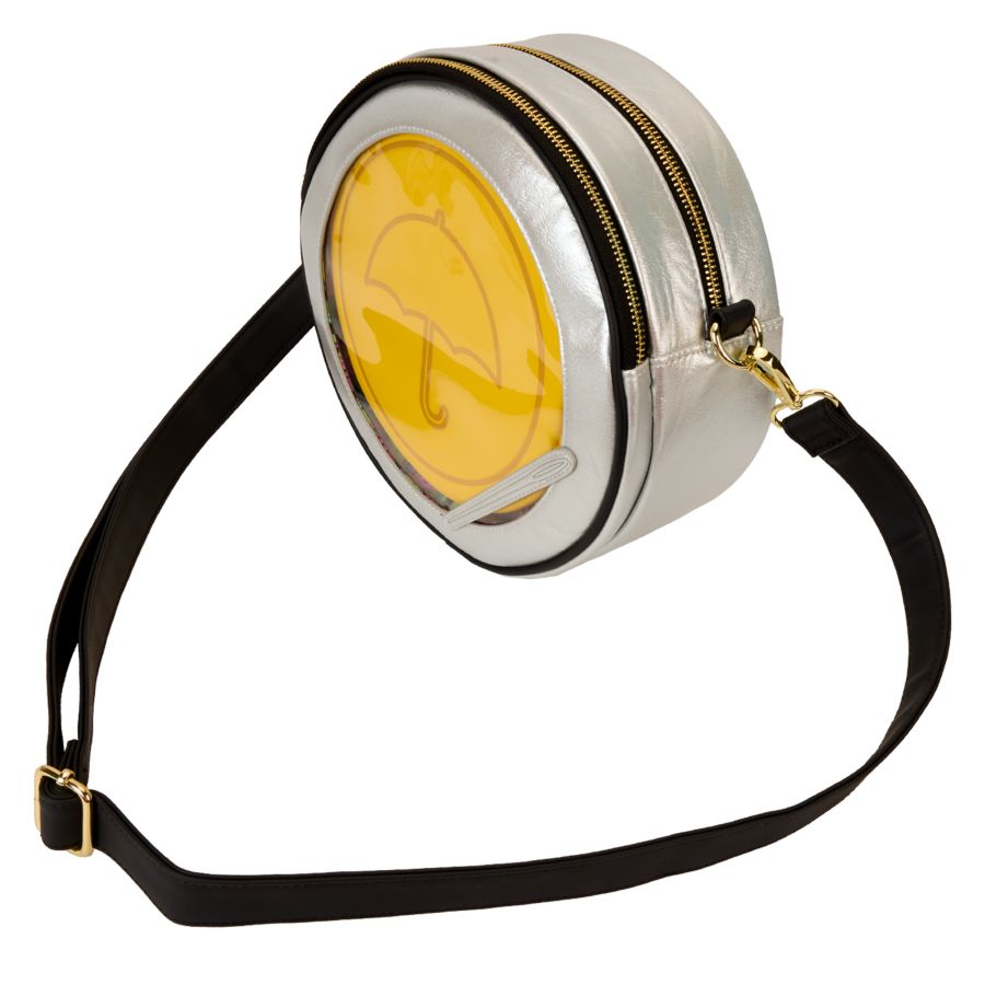 Capture iconic moments from the Netflix series with this accessory, which showcases the Dalgana Candy challenge. This fully figural bag, in the circular shape of a candy tin, holds a reversible and detachable yellow coin bag. The coin bag displays the umbrella shape on one side, and a triangle on the other. Silver metallic faux leather adds extra sparkle, along with clear PVC material on the front. A die-cut applique of the cutting utensil for this game adds a realistic detail. Pack your daily essentials and take on any challenge in style.